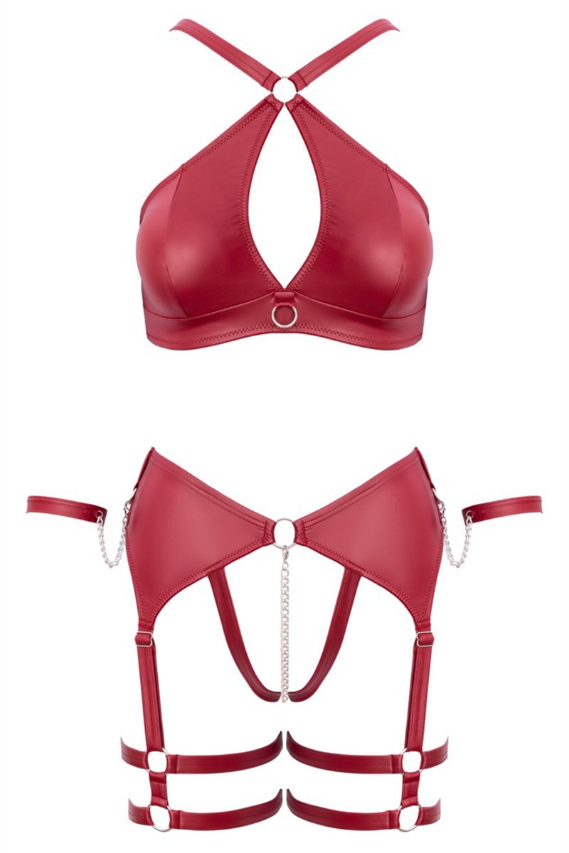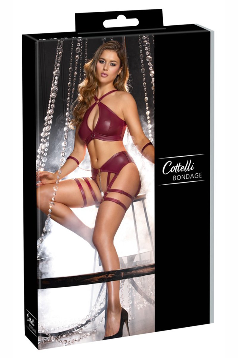 Cet ensemble de lingerie signé Cottelli BONDAGE se pare d’un magnifique rouge foncé mat, rehaussé d’accessoires argentés. Il est composé d’un soutien-gorge souple, d’un string ouvert avec porte-jarretelles et de menottes souples. Conçu dans une matière douce et entièrement élastique, il offre un confort absolu tout en sublimant votre silhouette.