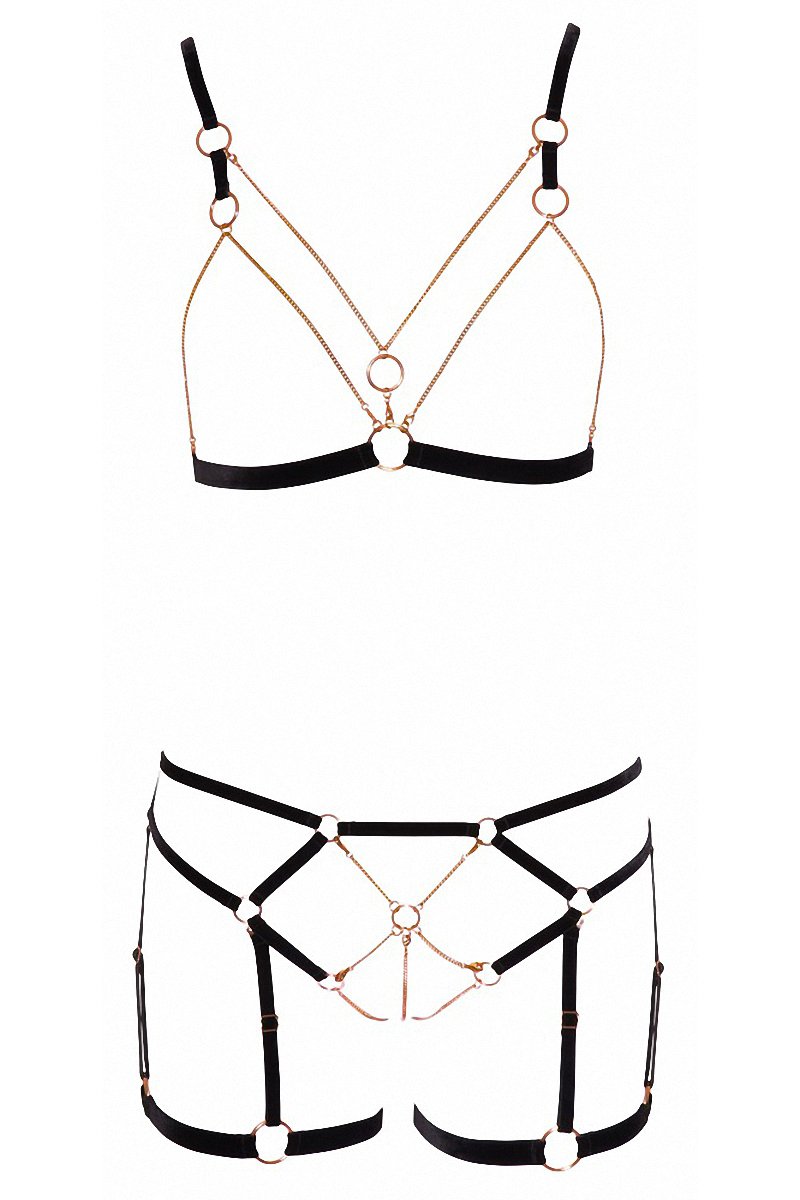 – Ensemble fantaisie harnais/bijoux 2 pièces : culotte ouverte avec jarretières amovibles, et soutien-gorge seins nus