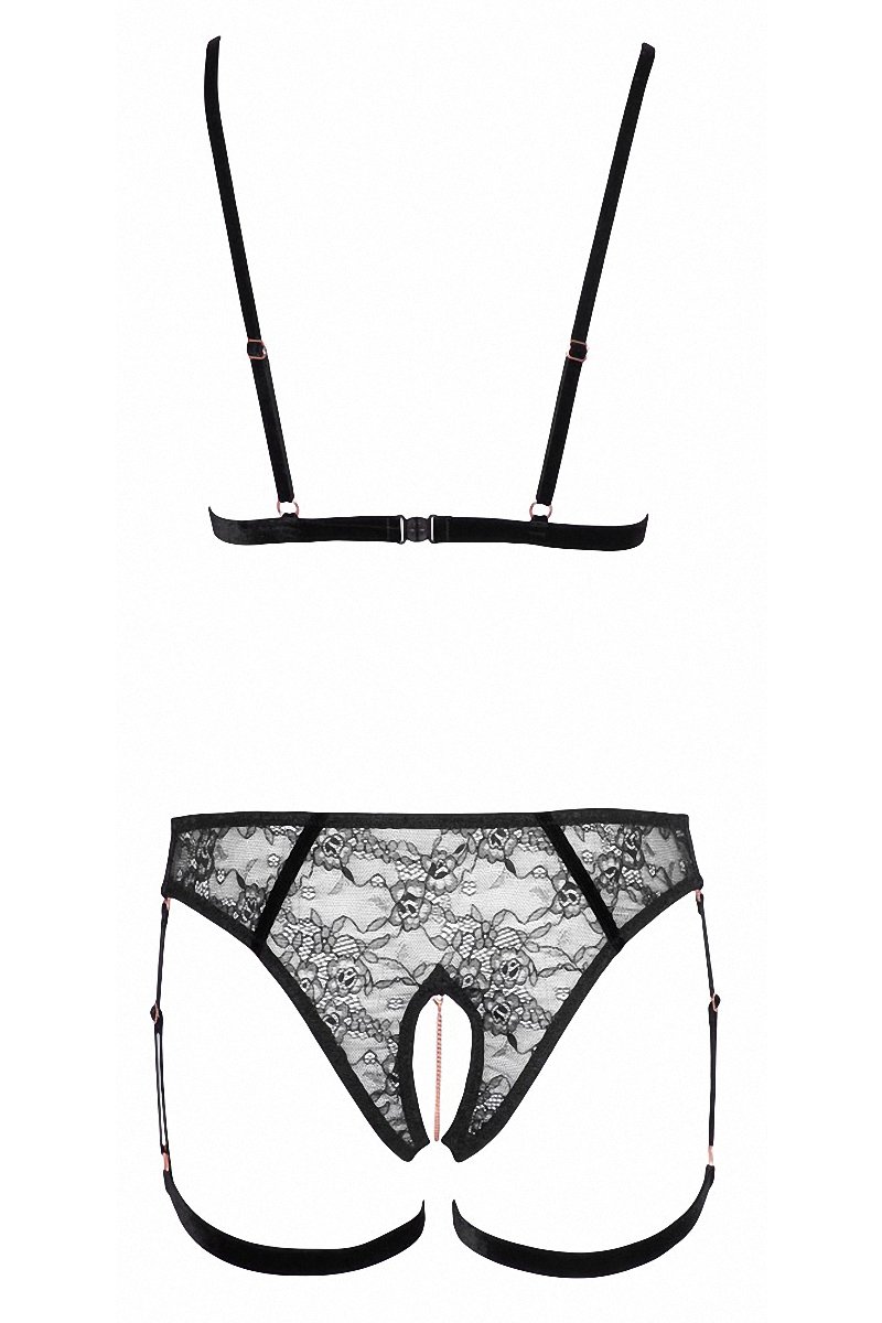 De dos, la culotte s’encanaille de dentelle fendue sur les fesses, et le soutien gorge cultive l’illusion avec son attache dorsale et ses bretelles réglables.